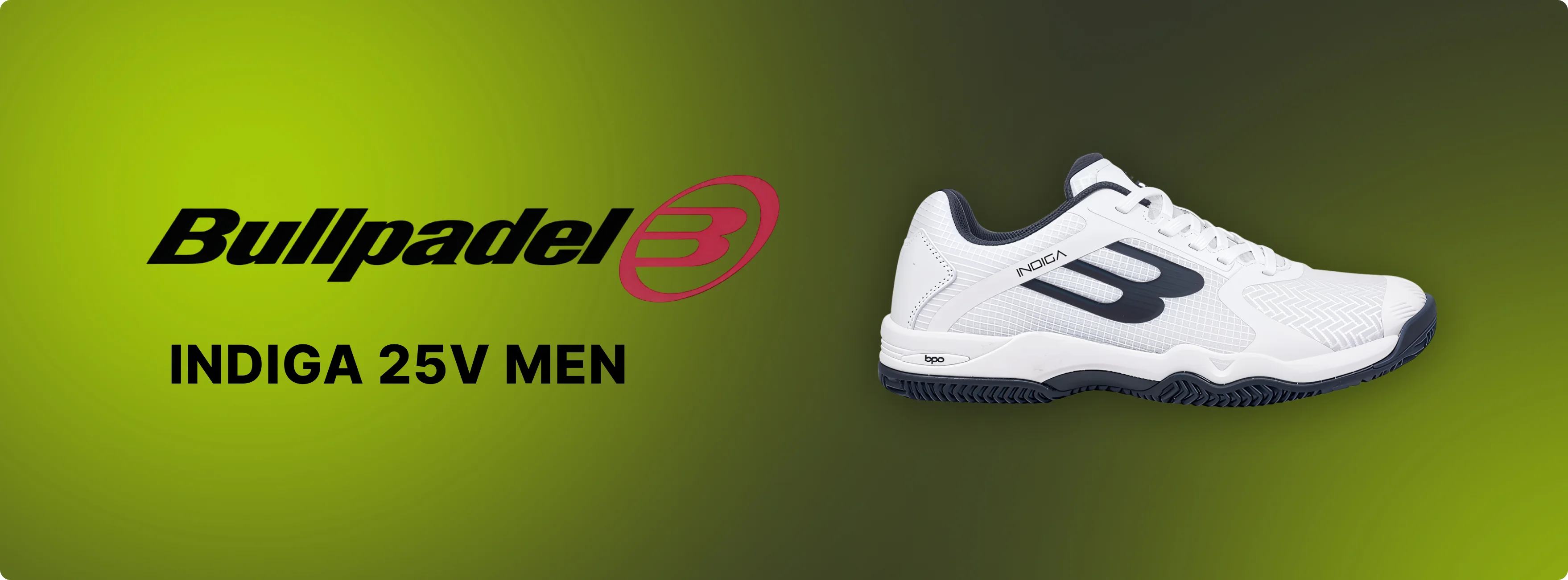 Bullpadel Indiga 25V Men White are lightweight and comfortable padel shoes designed for beginners and intermediate players. They provide excellent ventilation, stability, and flexibility during active play, helping you maintain confident control on the court.