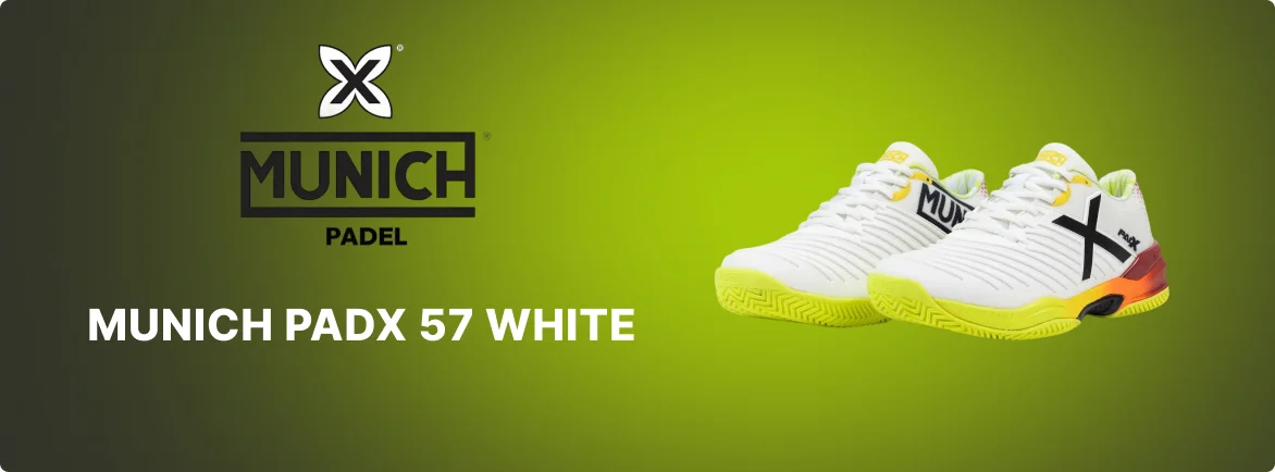 O calçado de padel Munich PADX 57 White é um modelo técnico desenvolvido para jogo intenso pela marca Munich, que conta com mais de 80 anos de experiência em calçado desportivo profissional. A marca é reconhecida pelo foco em grip / tração, estabilidade e durabilidade — parâmetros essenciais no padel moderno.