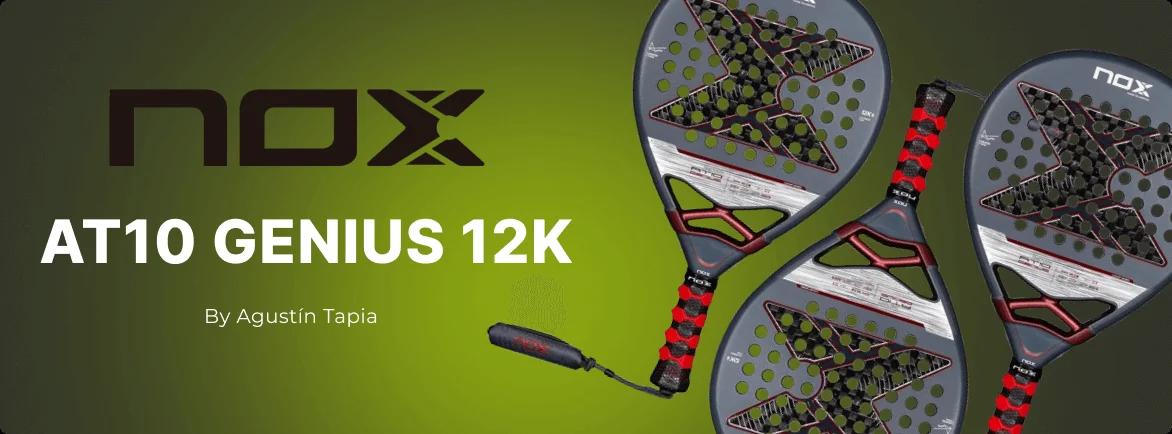 Nox AT10 Genius 12K — equilíbrio perfeito entre potência e controlo. Nox AT10 Genius 12K é uma raquete com equilíbrio perfeito entre potência e controlo. Desenvolvida em colaboração com Agustín Tapia — não é apenas um nome na caixa, mas uma verdadeira participação de um profissional que sabe o que é necessário em campo. Esta raquete faz parte da gama de elite Luxury Series da Nox. Combina elevada rigidez, precisão e controlo. A sua forma em gota, peso leve e características avançadas permitem jogar a alta velocidade e com máximo efeito na bola.
