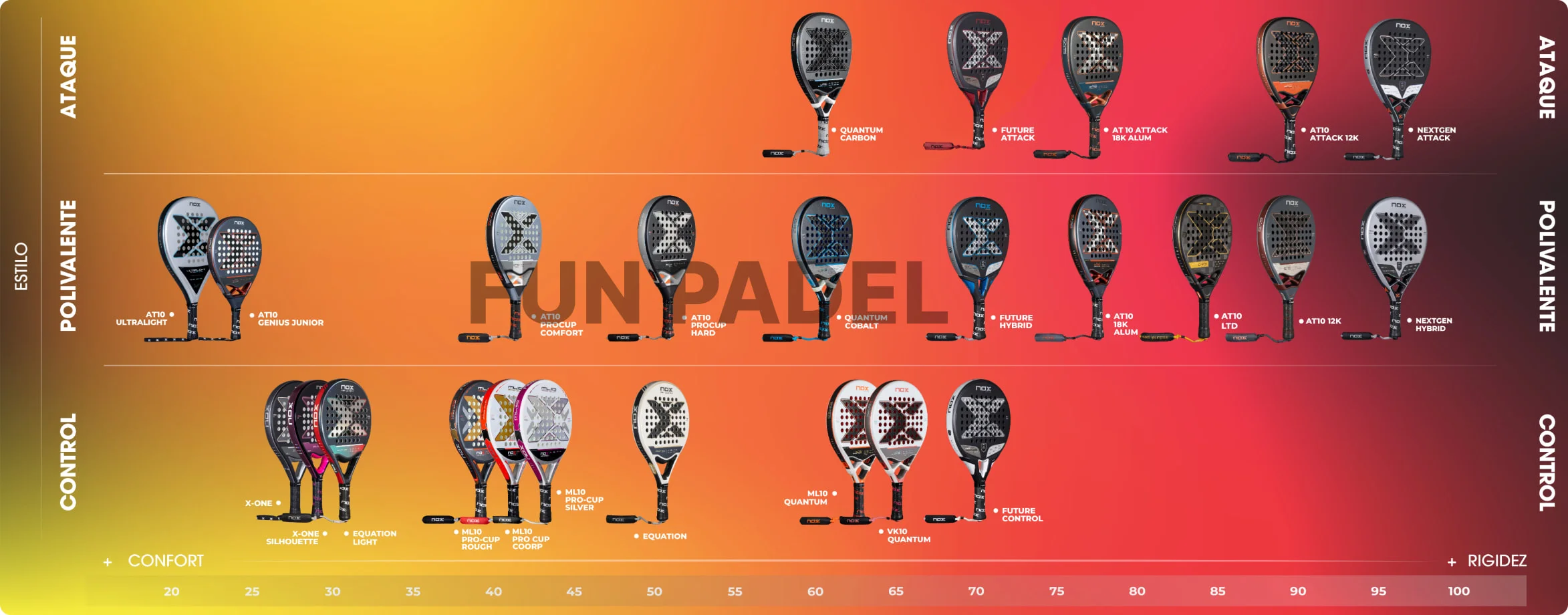 Comparada com a Nox ML10 Pro Cup, a Future Hybrid 12K Alum foca mais no jogo dinâmico e efeitos. Em relação à AT10 Genius Attack, esta raquete é mais equilibrada e adequada para jogo tanto ofensivo quanto defensivo.