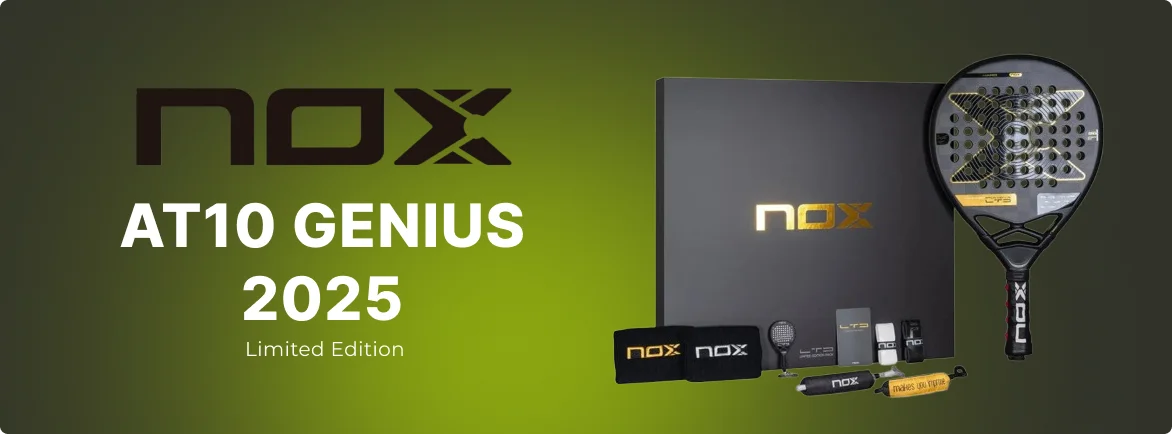 O conjunto NOX AT10 Genius Limited Edition 2025 é uma oferta exclusiva para os fãs da marca NOX e jogadores que buscam o mais alto nível de desempenho. O kit inclui a raquete de padel principal AT10 Genius LTD Edition 2025, além de acessórios originais NOX. Esta edição limitada foi criada em colaboração com Agustín Tapia e destina-se a jogadores que valorizam o equilíbrio entre potência, controlo e versatilidade.