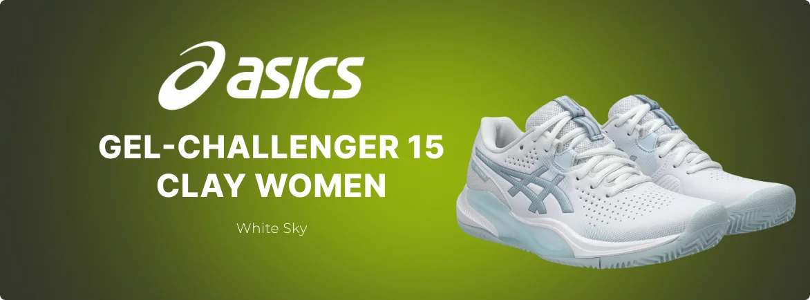 Asics Gel-Challenger 15 Clay Women White Sky são calçado de padel feminino estável para jogar padel e ténis em courts de terra batida. Este modelo popular combina amortecimento GEL, suporte lateral reforçado e um solado durável. Garante movimento lateral estável sem riscos adicionais e ajuda a controlar o deslizamento. Asics Gel-Challenger 15 é procurado tanto por jogadores avançados como por amadores de ténis e padel.