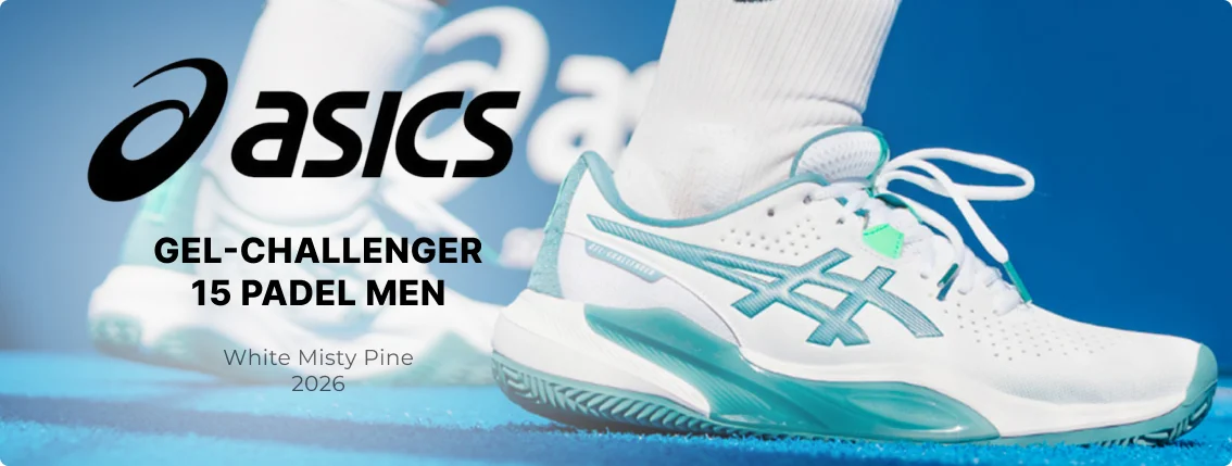 Asics Gel-Challenger 15 Padel Men White Misty Pine — calçado de padel estável com suporte lateral reforçado, solado resistente ao desgaste e sistema de fixação bem estruturado. O modelo 2026 foi desenvolvido para treino intensivo e competição, onde o controlo, a durabilidade e o movimento lateral seguro são essenciais.