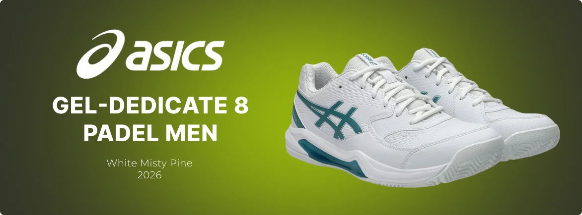 Asics Gel-Dedicate 8 Padel Men White Misty Pine é um modelo de calçado de padel técnico com amortecimento GEL, estabilidade TRUSSTIC e solado Clay Court para grip / tração fiável em relva sintética com areia. Indicado para jogadores de nível iniciante a intermédio que procuram controlo, suporte e desempenho previsível em court.