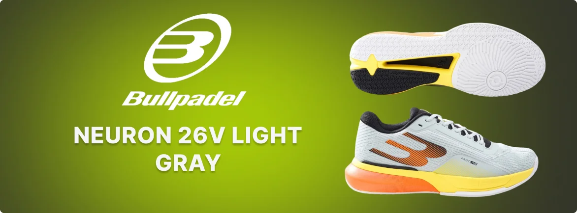 Bullpadel Neuron 26V Light Gray — calçado de padel profissional para a época de 2026, desenvolvido para jogo rápido e alta intensidade. O modelo escolhido por Fede Chingotto oferece ao jogador estabilidade, controlo no movimento lateral e confiança em cada ponto, melhorando o desempenho em campo.