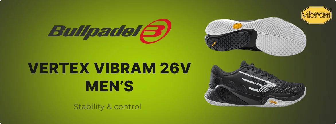 A colaboração entre a Bullpadel e a Vibram apresenta em 2026 os ténis masculinos Bullpadel Vertex Vibram 26V Men Black. Calçado de padel profissional para jogo intensivo, onde as principais vantagens são a estabilidade, o controlo dos movimentos e a durabilidade dos materiais. Vibram (espinha de peixe + omni) garante desempenho de alto nível independentemente da superfície, enquanto os materiais técnicos do solado permitem controlar o deslizamento e mover-se com facilidade em todas as direções.