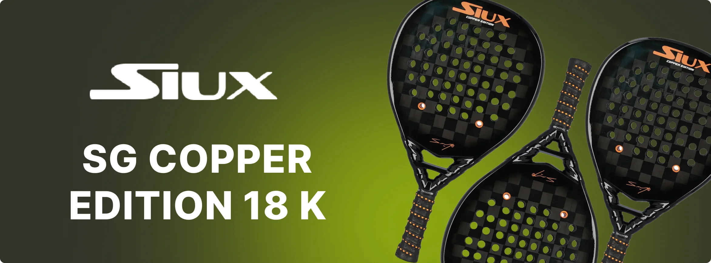 Siux SG Copper Edition 18K — uma raquete de padel elegante e de alta tecnologia que combina controlo, potência e durabilidade. Apresenta acabamento sofisticado em cobre 18K e design moderno em preto e laranja, proporcionando um jogo confortável e preciso em qualquer nível.
